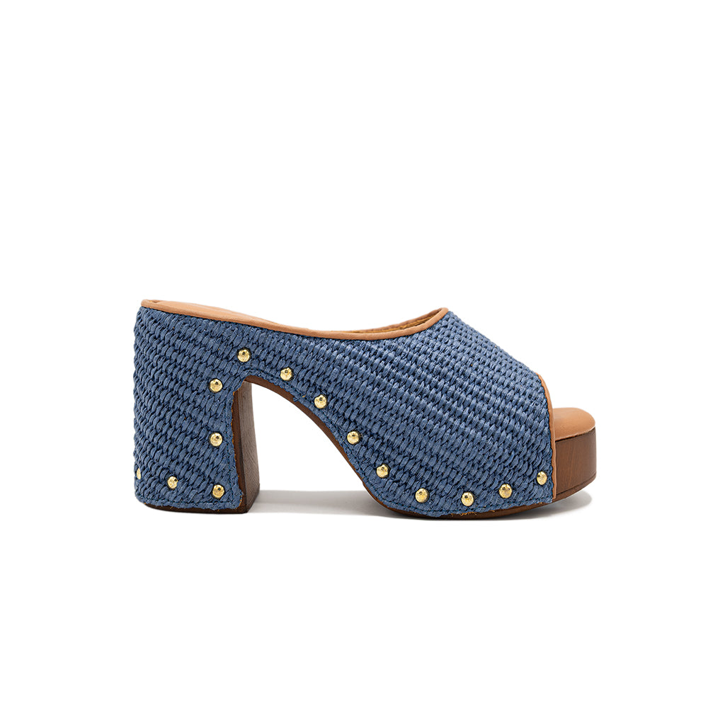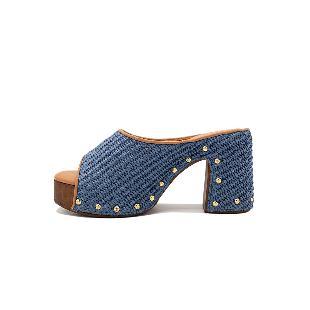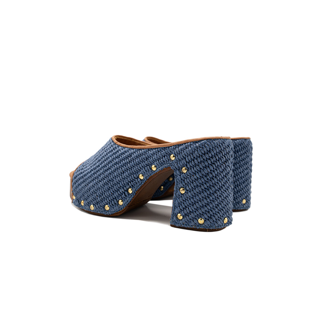 • Suola rivestita in rafia e delimitata da borchie dorate;