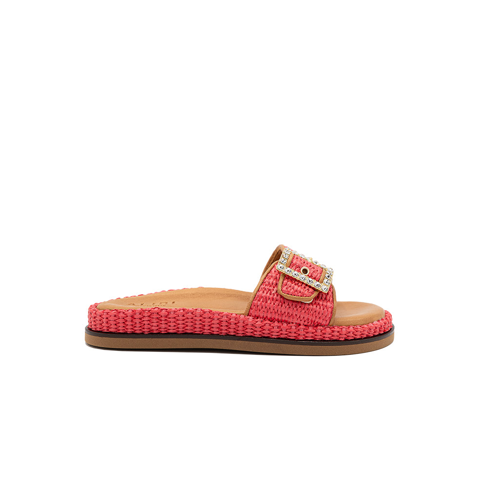 Una mezcla perfecta de comodidad y estilo: Nina es la sandalia que combina ligereza y sofisticación en un diseño esencial. La banda de rafia, decorada con una hebilla de strass y rematada con un ribete de piel, añade un toque refinado y luminoso.