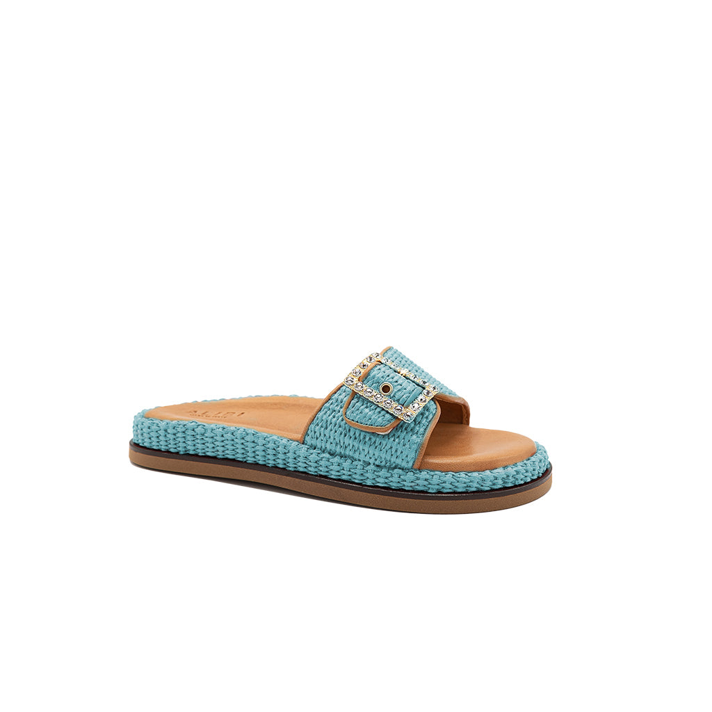 Una mezcla perfecta de comodidad y estilo: Nina es la sandalia que combina ligereza y sofisticación en un diseño esencial. La banda de rafia, decorada con una hebilla de strass y rematada con un ribete de piel, añade un toque refinado y luminoso.